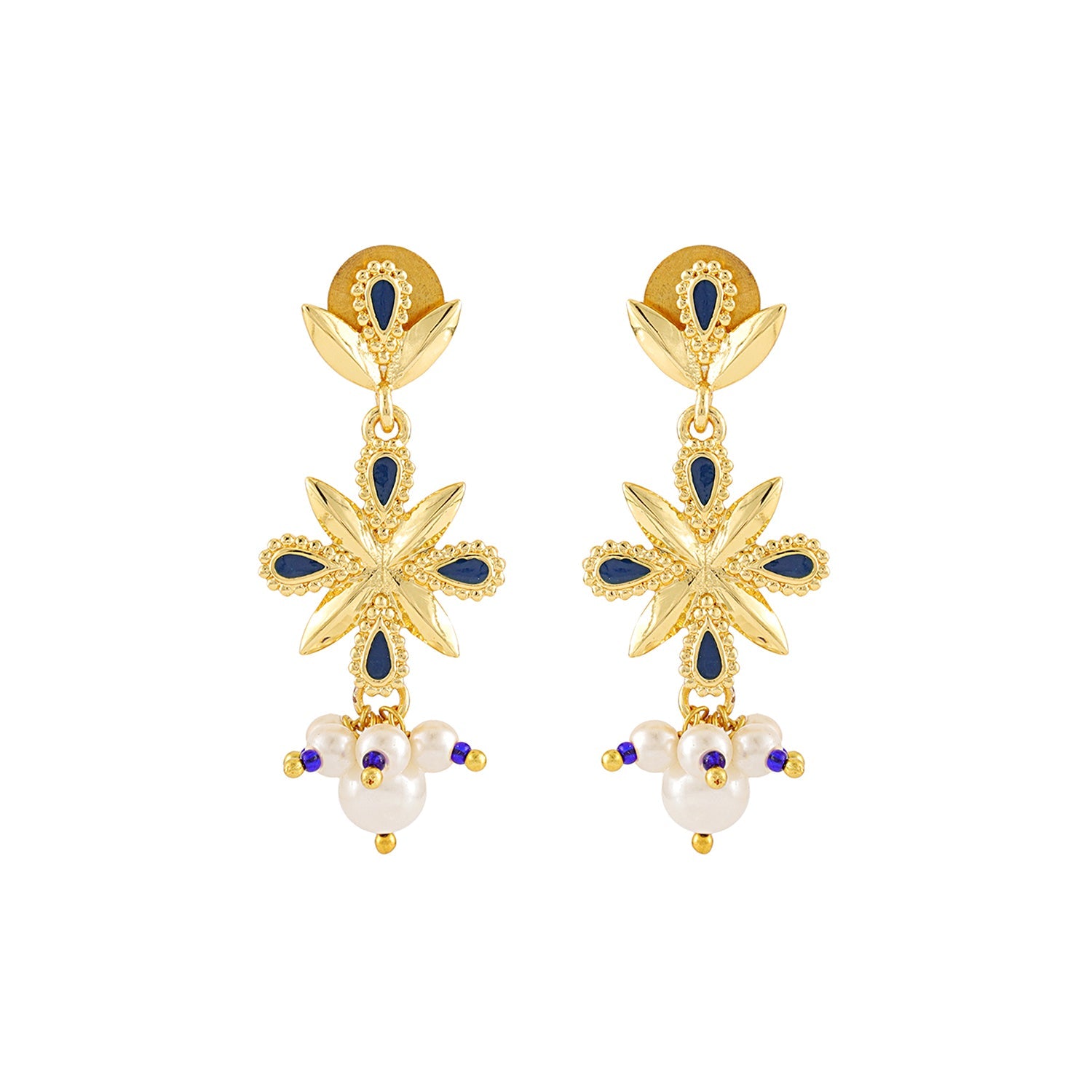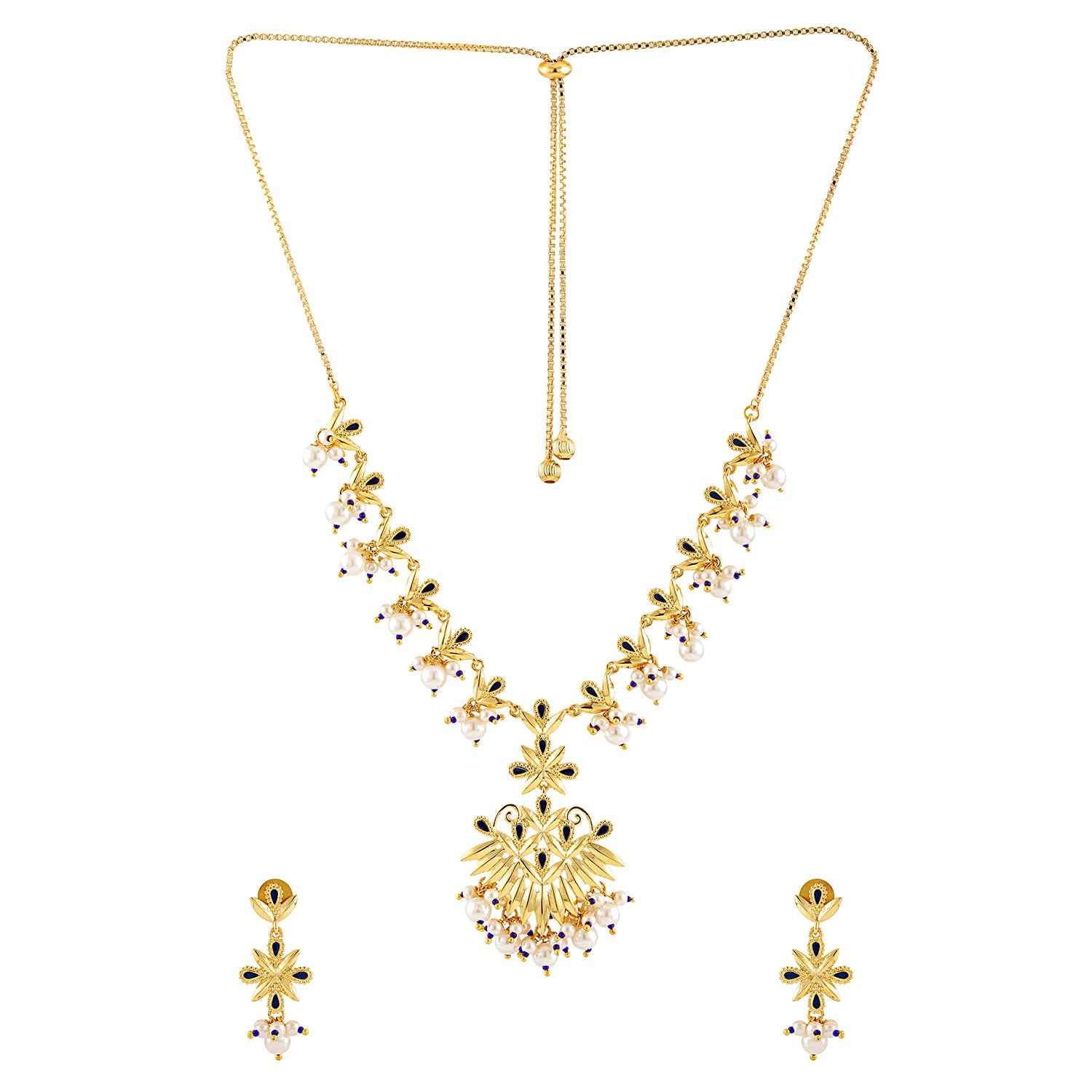 The Gota Patti Shahi Guldaasta Necklace Set is a true celebration of royal artistry and festive beauty. Inspired by Rajasthan’s timeless Gota Patti embroidery, this necklace set transforms heritage craft into jewellery that feels regal, elegant, and unforgettable. Handcrafted in premium brass, the design features a floral chain pattern decorated with golden enamel, clusters of radiant pearls, and a striking bouquet-style pendant that resembles a blooming guldaasta. Each detail has been thoughtfully crafted to reflect grace, richness, and festive grandeur. The necklace flows beautifully around the neckline with its intricate floral links, while the pendant adds depth and statement appeal. Complementing this are matching earrings that echo the floral and pearl-studded design, making it a complete look that’s both festive and versatile. Lightweight yet impactful, this ethnic enamel necklace set is ideal for weddings, poojas, and all your grand festive occasions. Whether styled with a traditional silk saree, an embellished lehenga, or even a fusion gown, the Shahi Guldaasta Necklace Set adds that perfect finishing touch of regality. It also makes for an elegant jewellery gift for women for your sister, mother, or as a thoughtful gift for girlfriend.